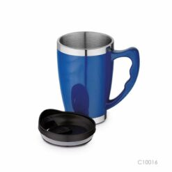 Stainless steel travel mug with lid and 450 ml capacity. This product is supplied in a box. 85 x 145 mm